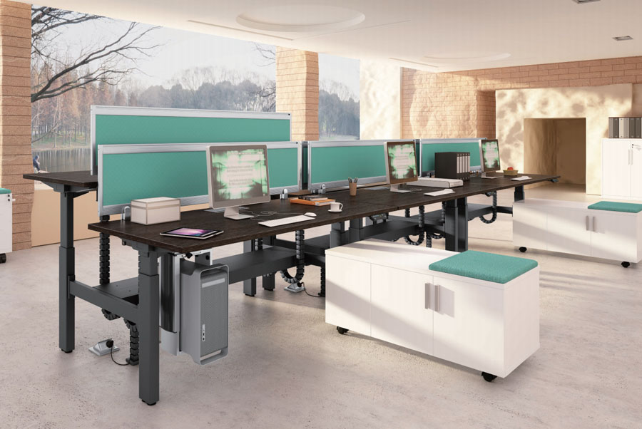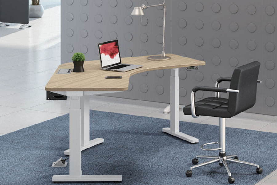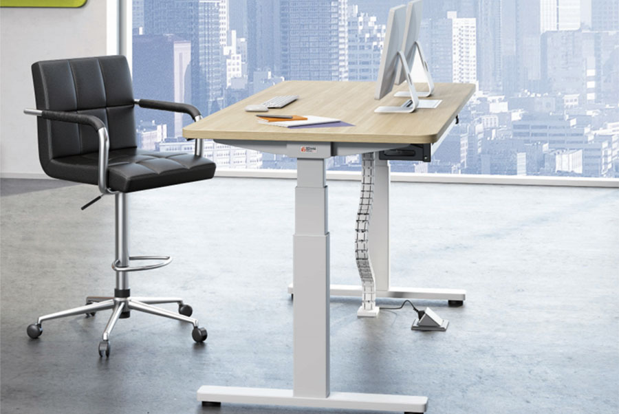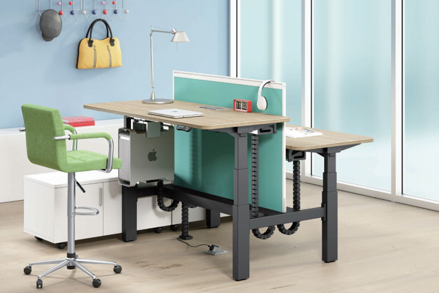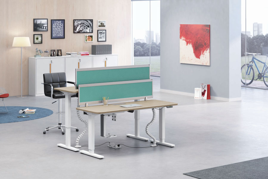 自动升降办公桌:一般会以两个以上机组实现升降,抽屉供放办公资料、文具、工具等。桌上电脑显示屏可随桌面一同升降,不影响正常电脑办公需要。