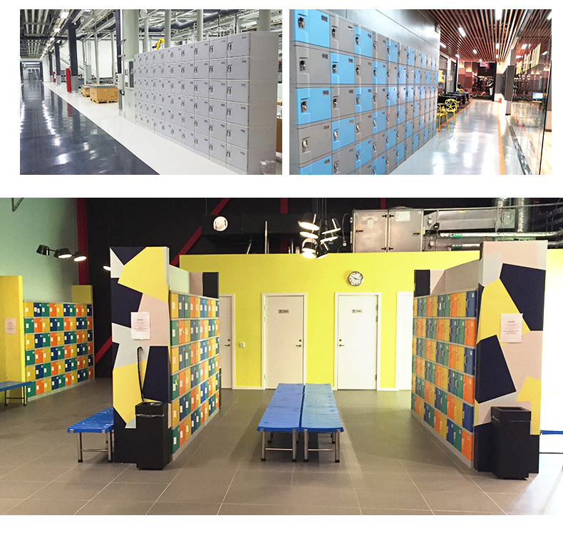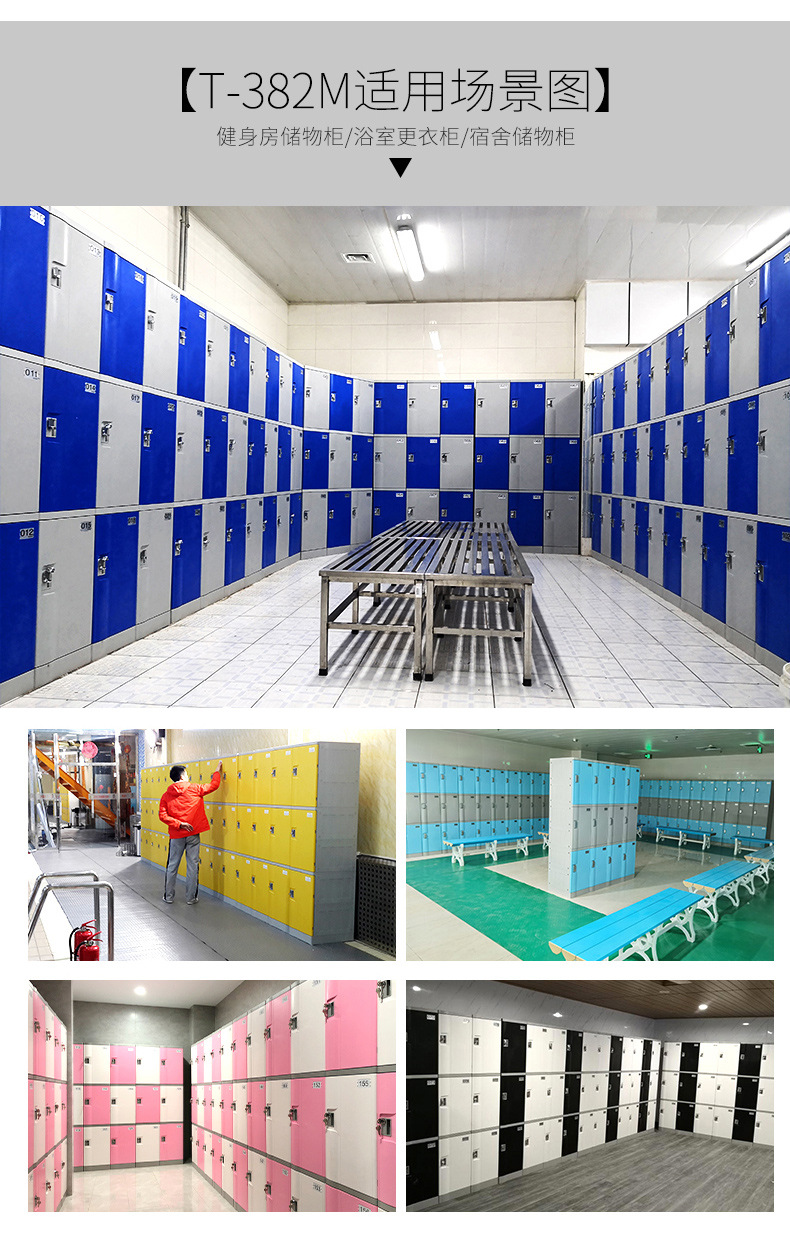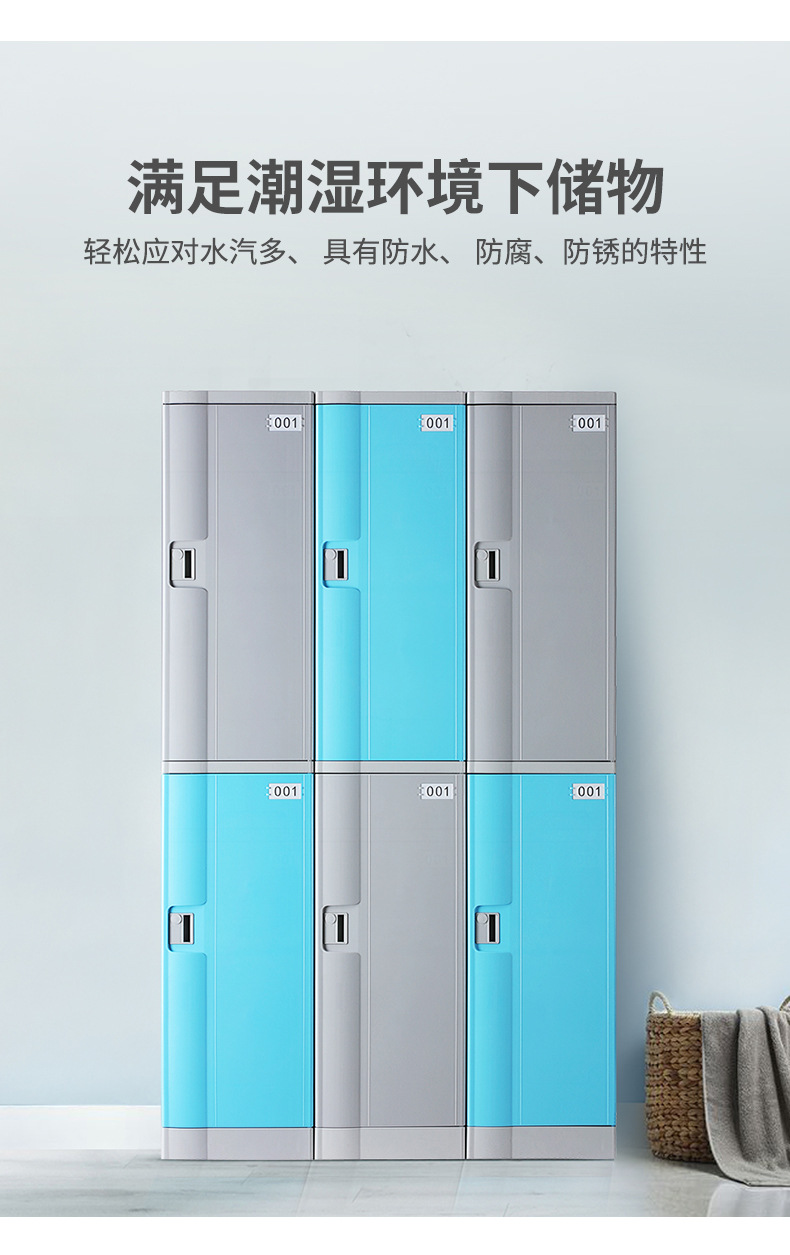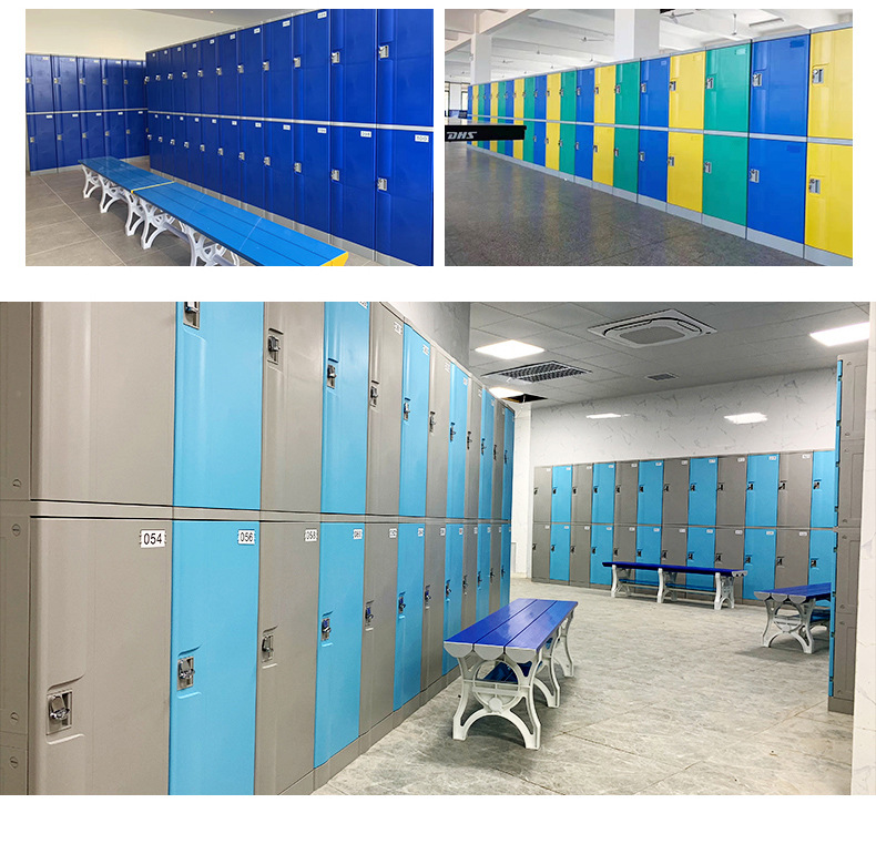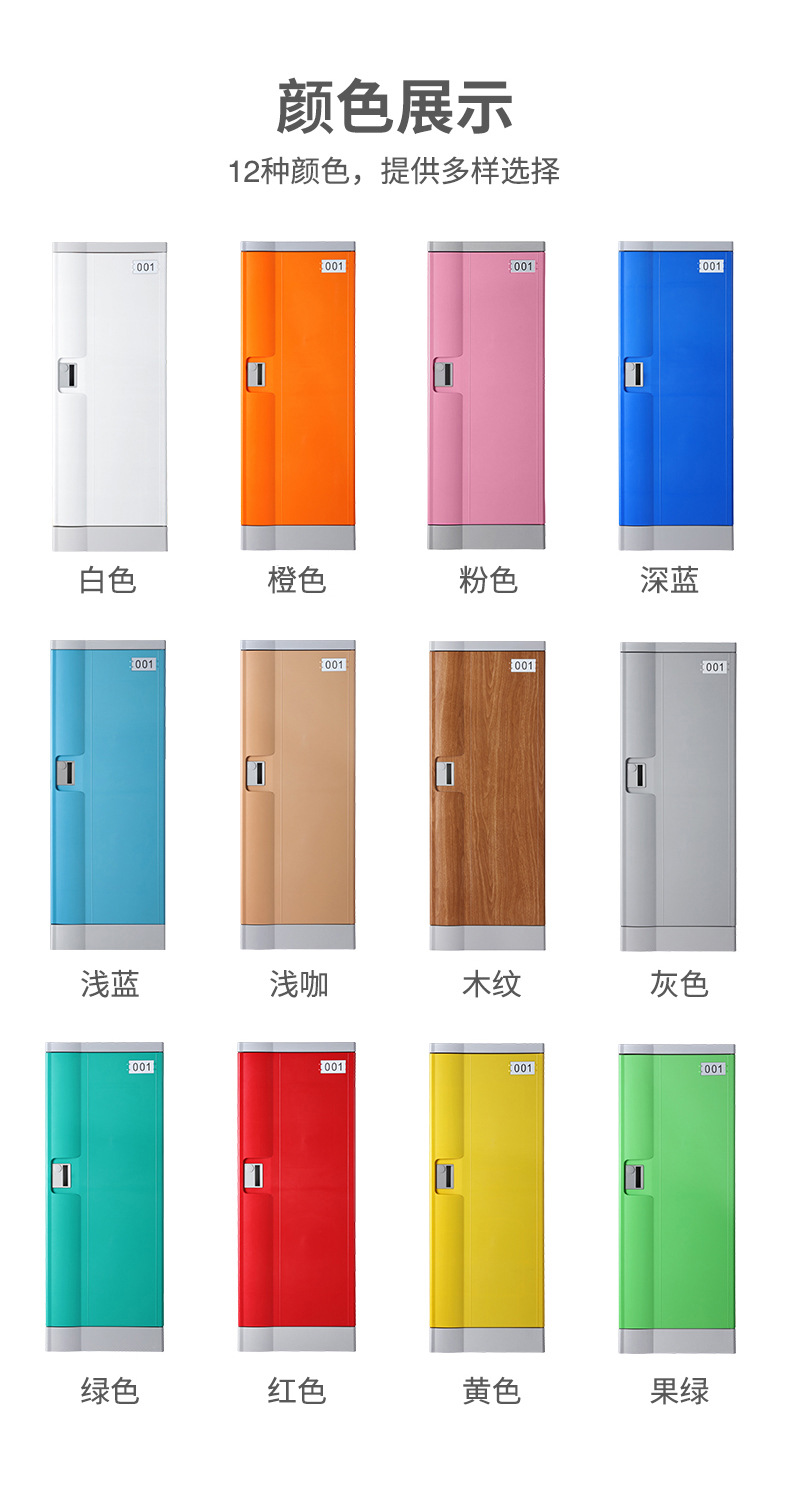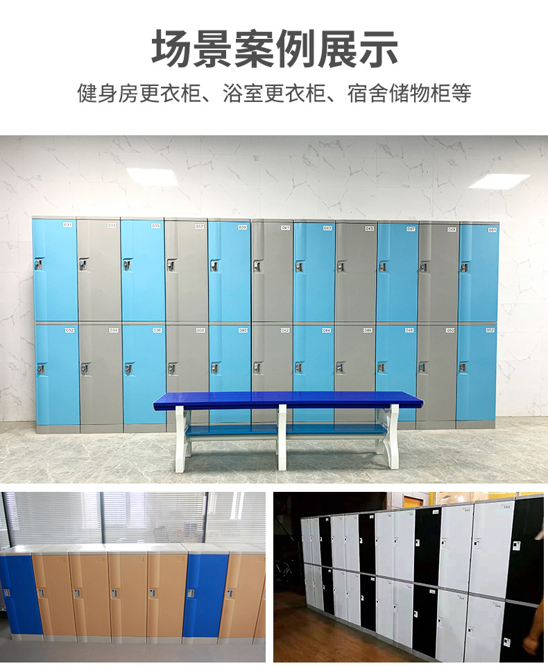 塑料更衣柜标配,拉手,标号牌,常规宽度4个门组合也可根据场地多门灵活组合。 常规颜色为:黄、绿、灰、蓝色等颜色(也可根据需要安装电子锁、机械锁、转锁扣、挂锁片等锁具)。