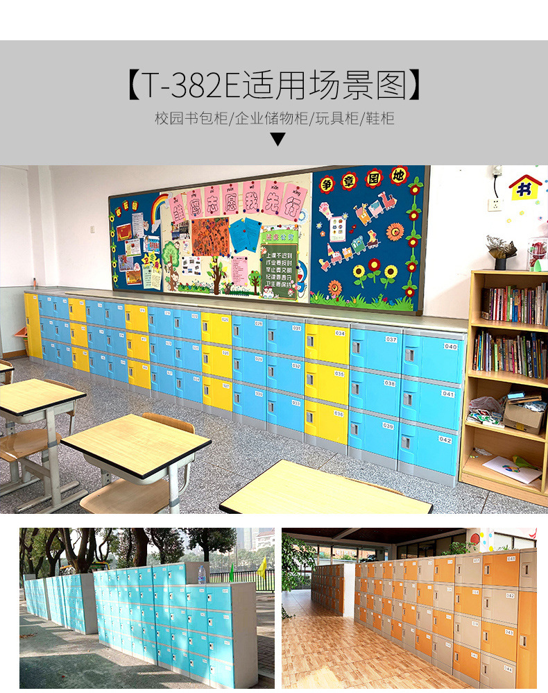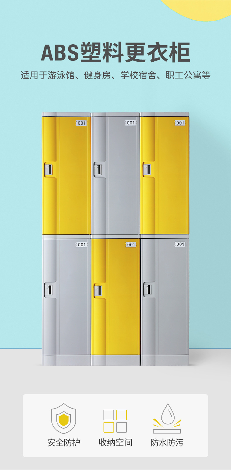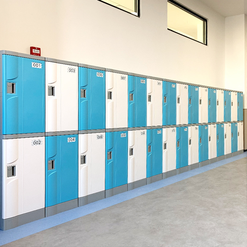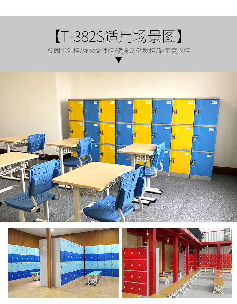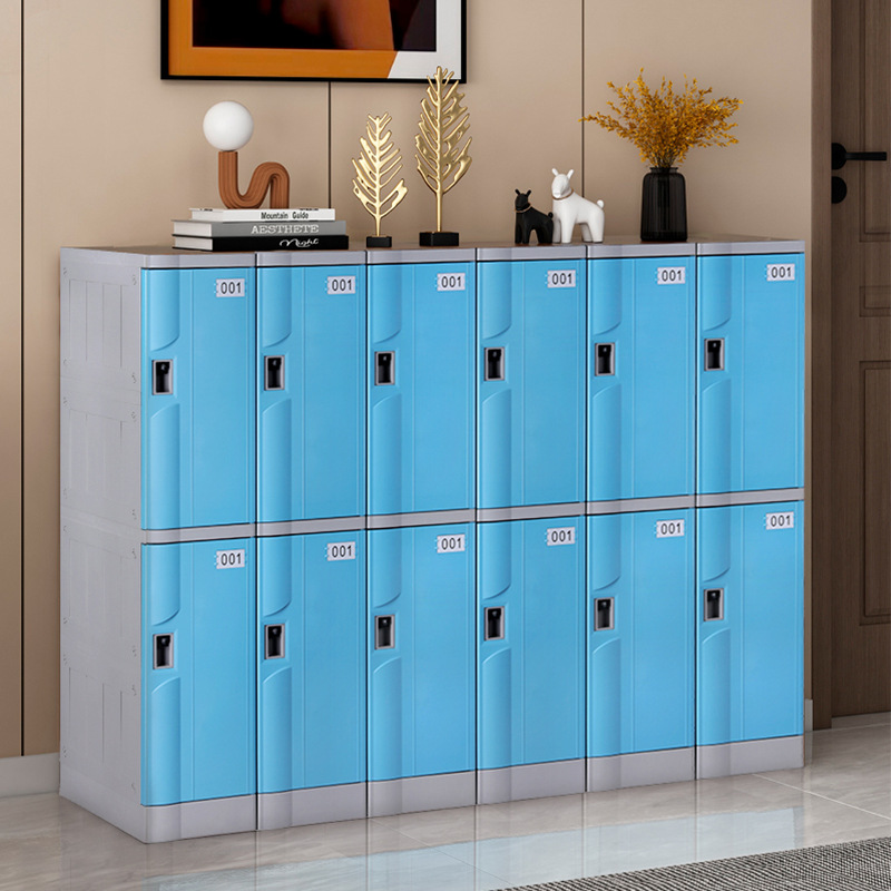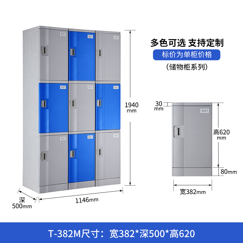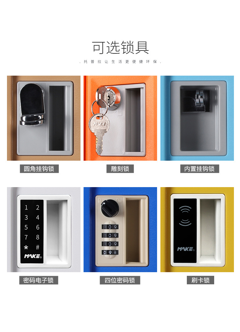 塑料更衣柜标配,拉手,标号牌,常规宽度4个门组合也可根据场地多门灵活组合。 常规颜色为:黄、绿、灰、蓝色等颜色(也可根据需要安装电子锁、机械锁、转锁扣、挂锁片等锁具)。