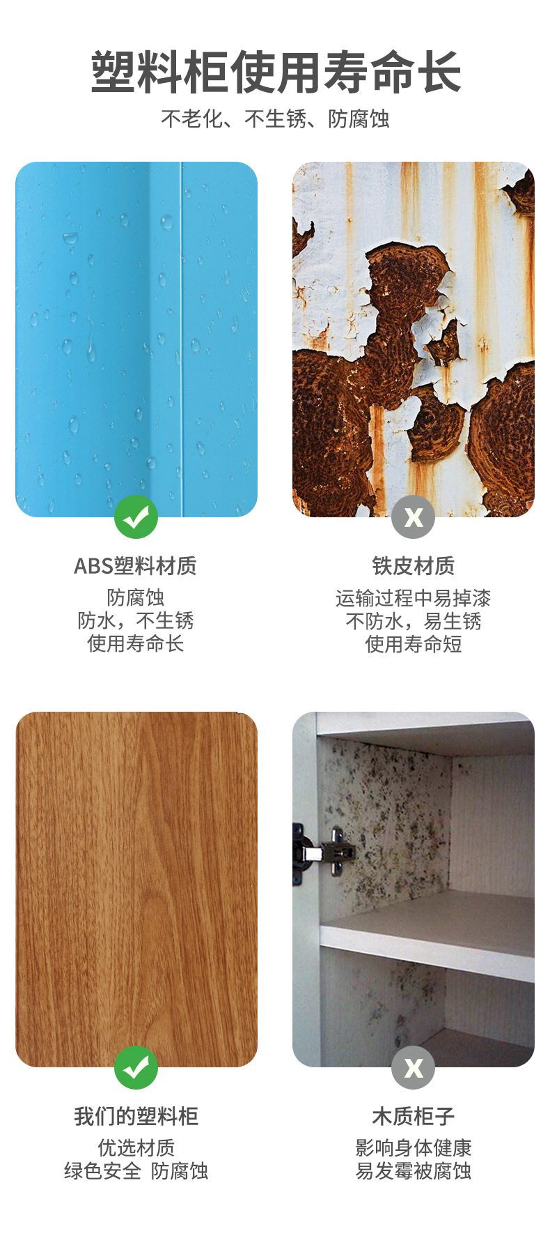 ABS塑料具有优良的综合性能,无毒无味、耐高温、耐腐蚀、电性能、耐磨性、抗化学药品性、染色性,成型加工和机械加工较好。ABS耐水、无机盐、碱和酸类,不溶于大部分醇类和烃类溶剂。ABS塑胶更衣柜,特别适合各类游泳馆、桑拿浴室、煤矿铁矿、地下室、学校工厂等场所。