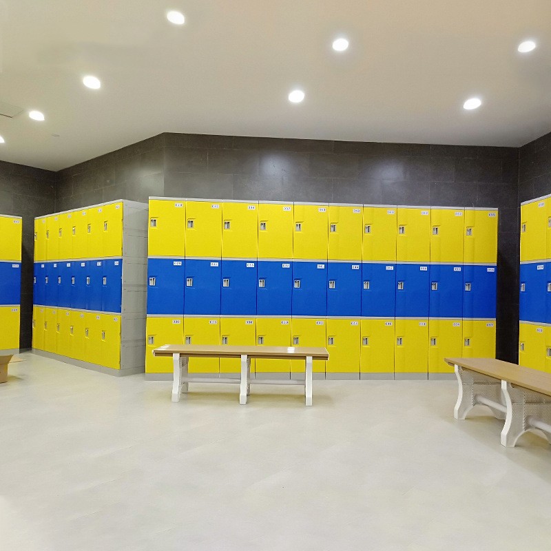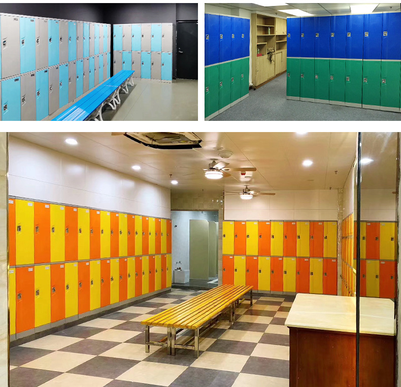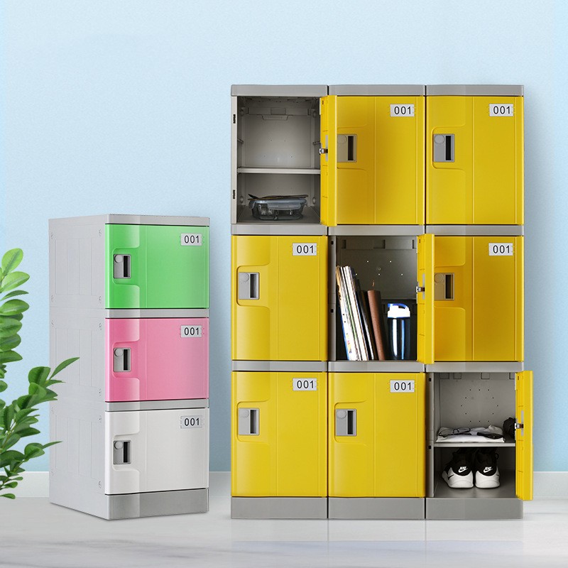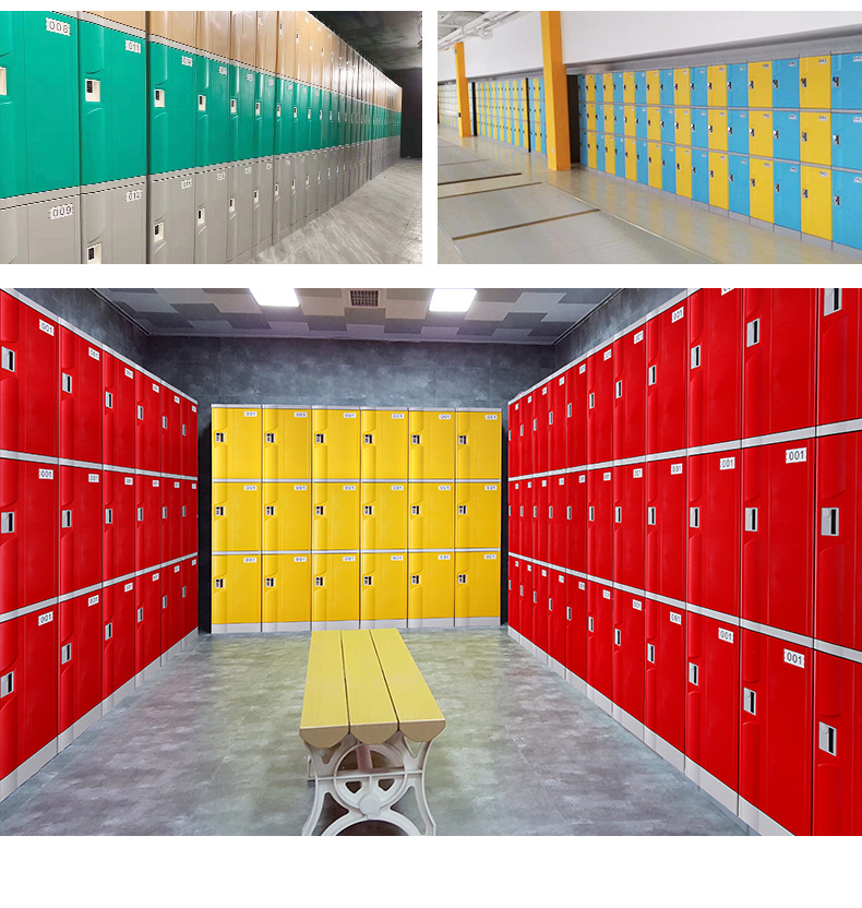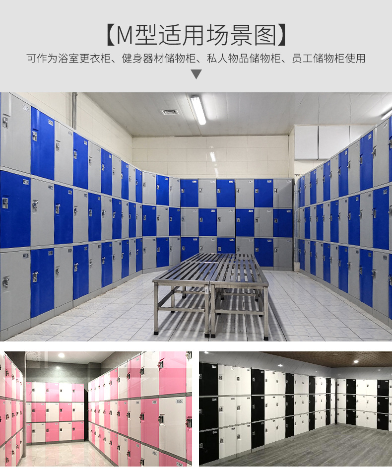 塑料更衣柜标配, 拉手, 标号牌, 可根据场地多门灵活组合。更多规格请咨询客服。 常规颜色为:黄、绿、灰、蓝色等颜色(也可根据需要安装电子锁、机械锁、转锁扣、挂锁片等锁