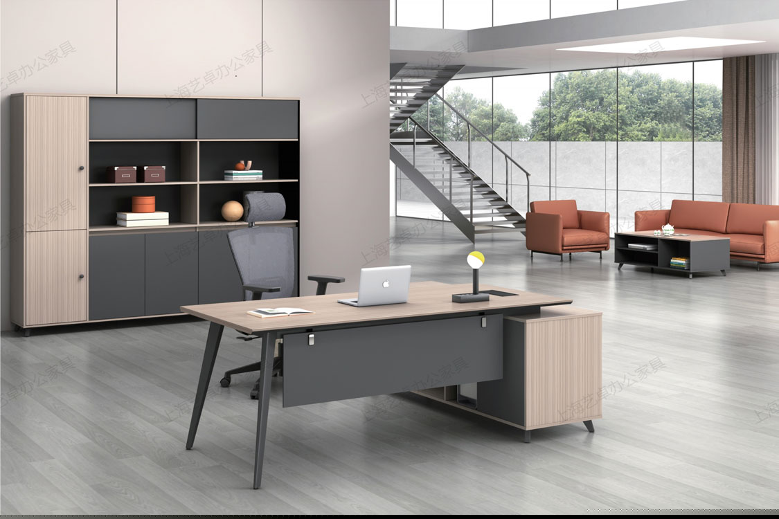 现代简约经理主管桌,忙碌的工作中难免会遇到不顺心的事,这时候换种姿势,换种心情,会有意想不到的收获。 班台配套侧柜,可放置皮包等大件物品,让您的办公室井井有条。工匠造美物,从简单中造出美。